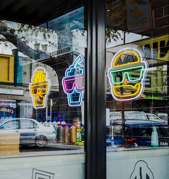 Custom Neon created 4 colourful burger themed light signs for the Geelong West store. The centerpiece, "Burgers & Dreams", is a curved sign featuring our Cotton Candy Pink and Tropical Blue shades. A modern take on retro burger joint signage, this iconic sign has become a popular backdrop for customers sharing photos of themselves enjoying a burger.